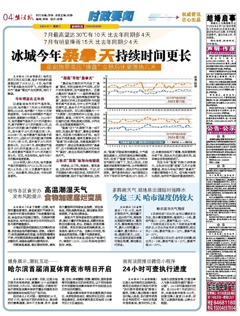生活报讯 (记者于海霞) 近期,哈市降雨量显著增加,高温高湿的气候条件,为食物中的微生物提供了快速繁殖的温床,食品安全风险随之增加。为确保汛期食品安全,哈市各区食安办向市民发出风险与营养健康提示。