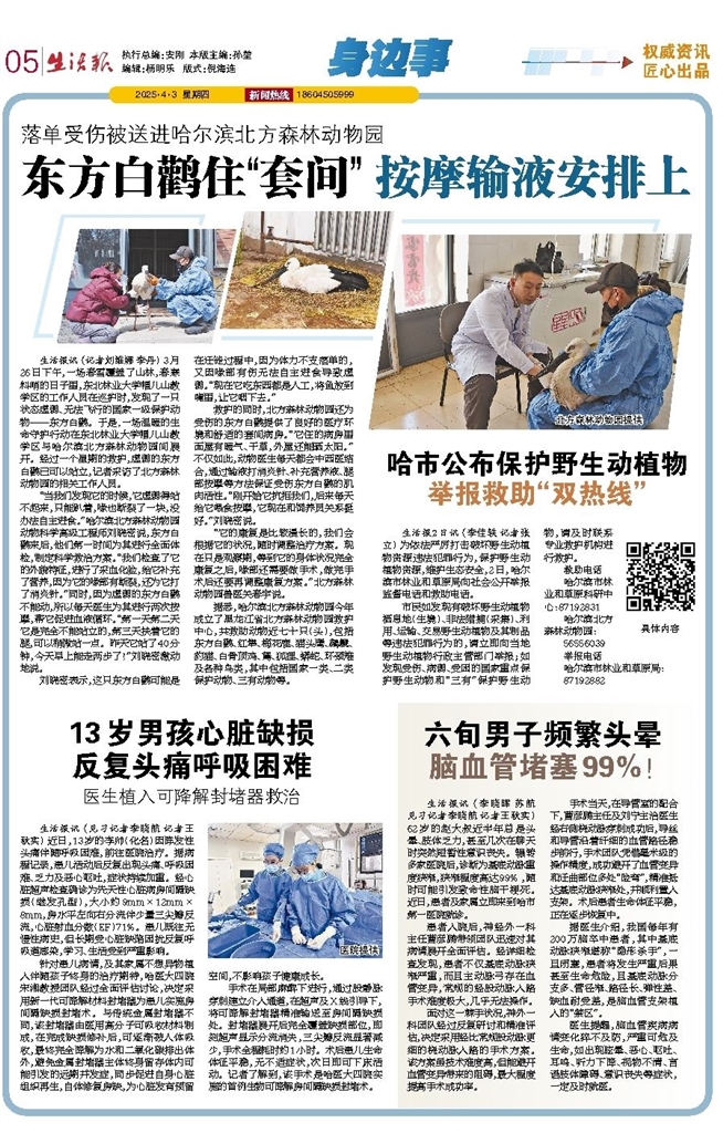 生活报讯 (记者刘维娜 李丹) 3月26日下午,一场春雪覆盖了山林,春寒料峭的日子里,东北林业大学帽儿山教学区的工作人员在巡护时,发现了一只状态虚弱、无法飞行的国家一级保护动物——东方白鹳。于是,一场温暖的生命守护行动在东