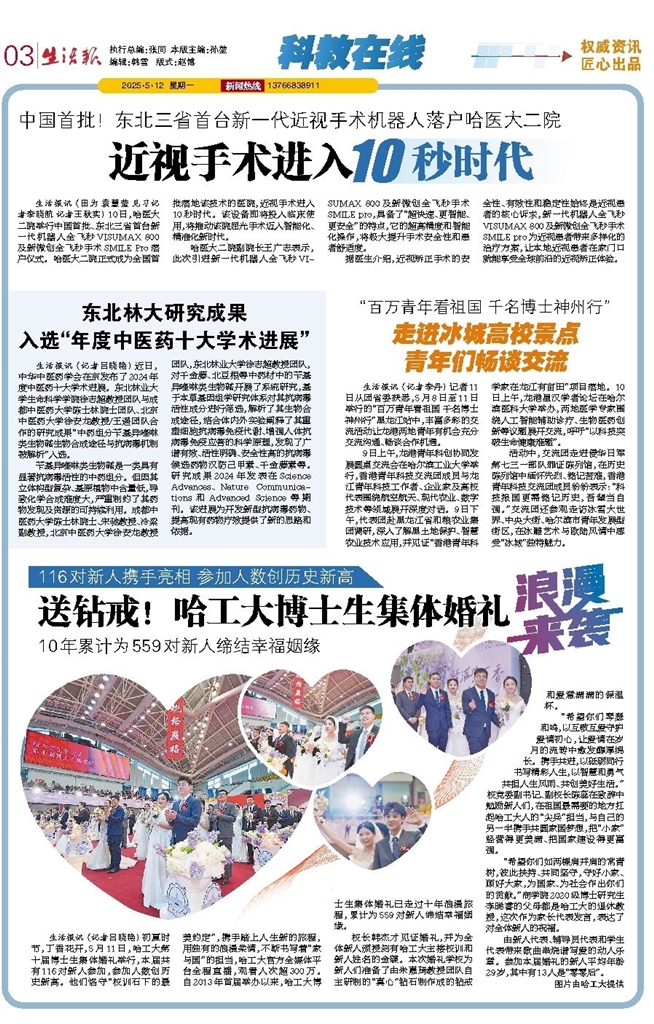 生活报讯 (记者吕晓艳) 初夏时节,丁香花开,5月11日,哈工大第十届博士生集体婚礼举行,本届共有116对新人参加,参加人数创历史新高。他们恪守“校训石下的最美约定”,携手踏上人生新的旅程,用独有的浪漫柔情,不断书写着“家