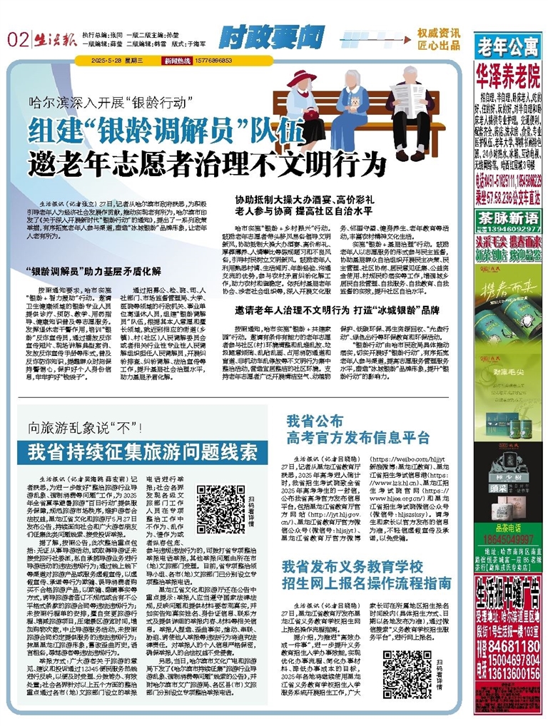 生活报讯 (记者张立) 27日,记者从哈尔滨市政府获悉,为积极引导老年人为经济社会发展作贡献,推动实现老有所为,哈尔滨市印发了《关于深入开展新时代“银龄行动”的通知》,提出了一系列政策举措,有序拓宽老年人参与渠道,塑造“冰