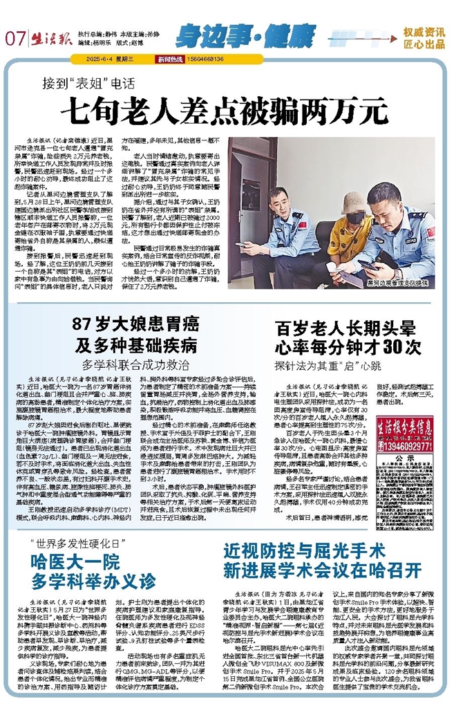 生活报讯 (见习记者李晓航 记者王秋实) 近日,哈医大一院为一名87岁胃癌伴消化道出血、幽门梗阻且合并严重心、脑、肺疾病的高龄患者,精准制定个体化治疗方案,实施腹腔镜胃癌根治术,最大程度地帮助患者解除病痛。