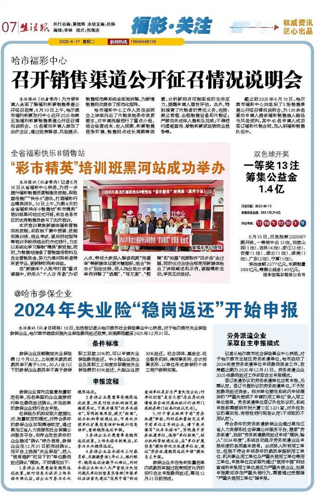 生活报讯 (记者李丹) 为方便申请人全面了解福利彩票销售渠道公开征召政策,6月10日上午,哈尔滨市福利彩票发行中心召开2025年第五场福利彩票销售渠道公开征召情况说明会。15名意向申请人参加了此次会议,通过政策解读、风险提