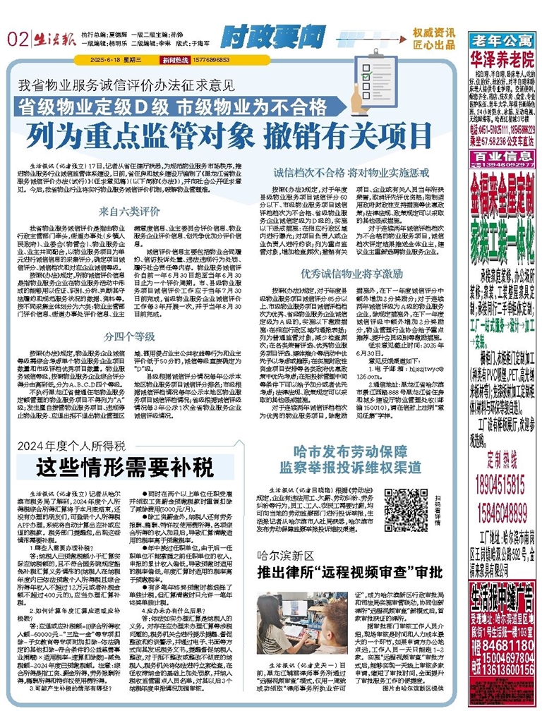 生活报讯 (记者张立) 17日,记者从省住建厅获悉,为规范物业服务市场秩序,推进物业服务行业诚信监管体系建设,日前,省住房和城乡建设厅编制了《黑龙江省物业服务诚信评价办法(试行)》(征求意见稿)(以下简称《办法》),并向社
