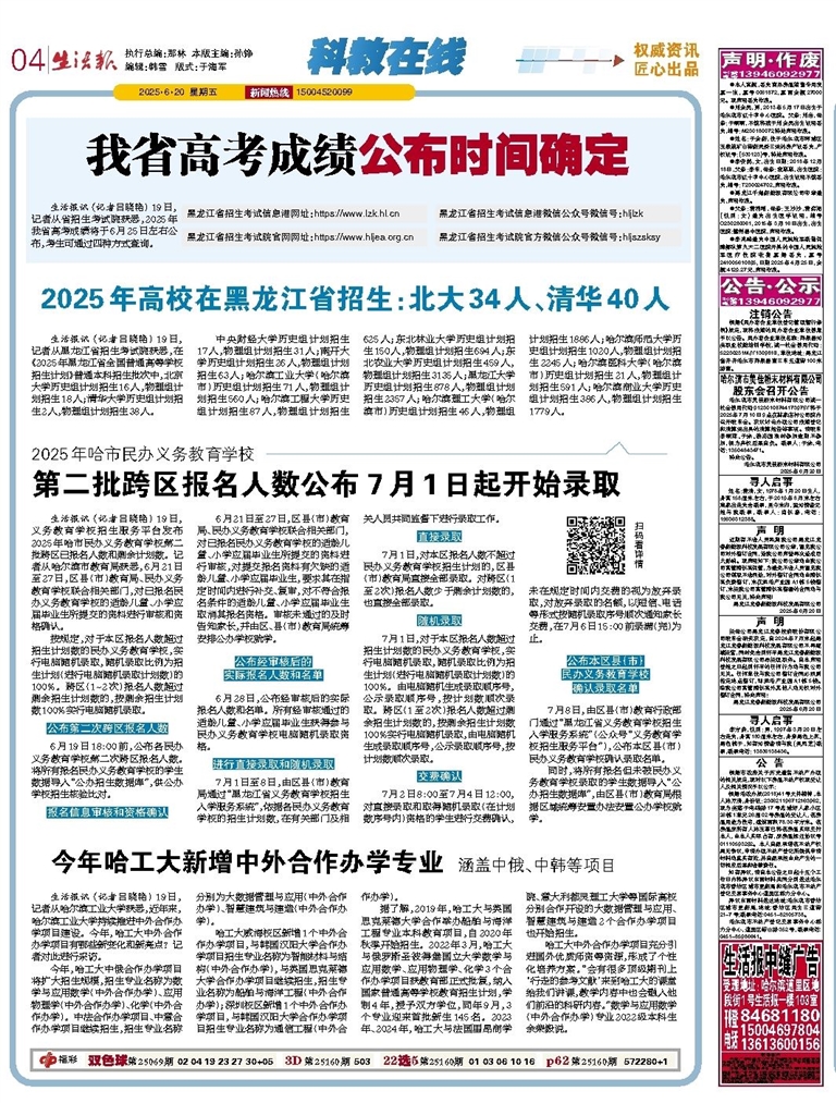 生活报讯 (记者吕晓艳) 19日,记者从黑龙江省招生考试院获悉,在《2025年黑龙江省全国普通高等学校招生计划》普通本科招生批次中,北京大学历史组计划招生16人,物理组计划招生18人;清华大学历史组计划招生2人,物理组计划