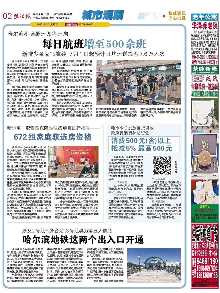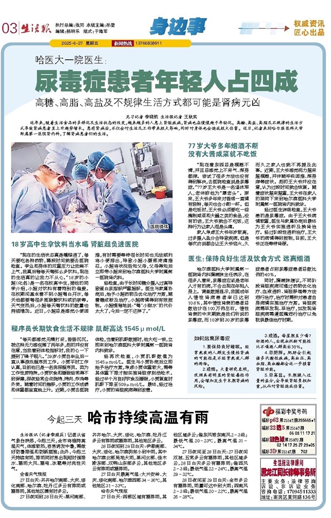 生活报讯 (见习记者李晓航 记者王秋实) 6月27日,哈医大四院松北院区于上午8:30-10:00开展义诊活动。十余位专家免挂号费看诊,前100名居民享“免费血糖检测”。