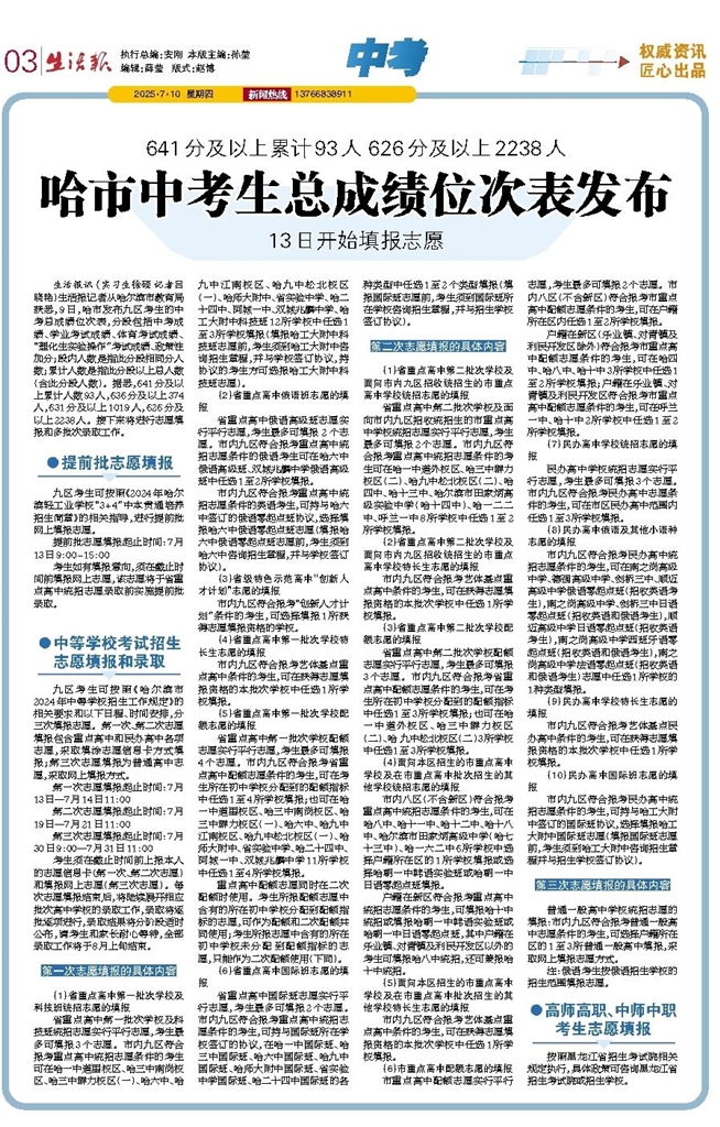 生活报讯 (实习生徐硕 记者吕晓艳)生活报记者从哈尔滨市教育局获悉,9日,哈市发布九区考生的中考总成绩位次表,分段包括中考成绩、学业考试成绩、体育考试成绩、“理化生实验操作”考试成绩、政策性加分;段内人数是指此分段相同分人