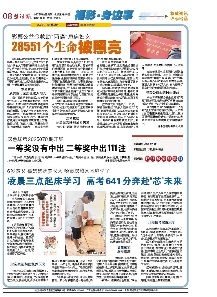 7月10日,双色球第2025078期开奖,一等奖没有中出,二等奖中出111注。奖池金额24.91亿元,本期销量3.50亿元,筹集公益金1.26亿元。