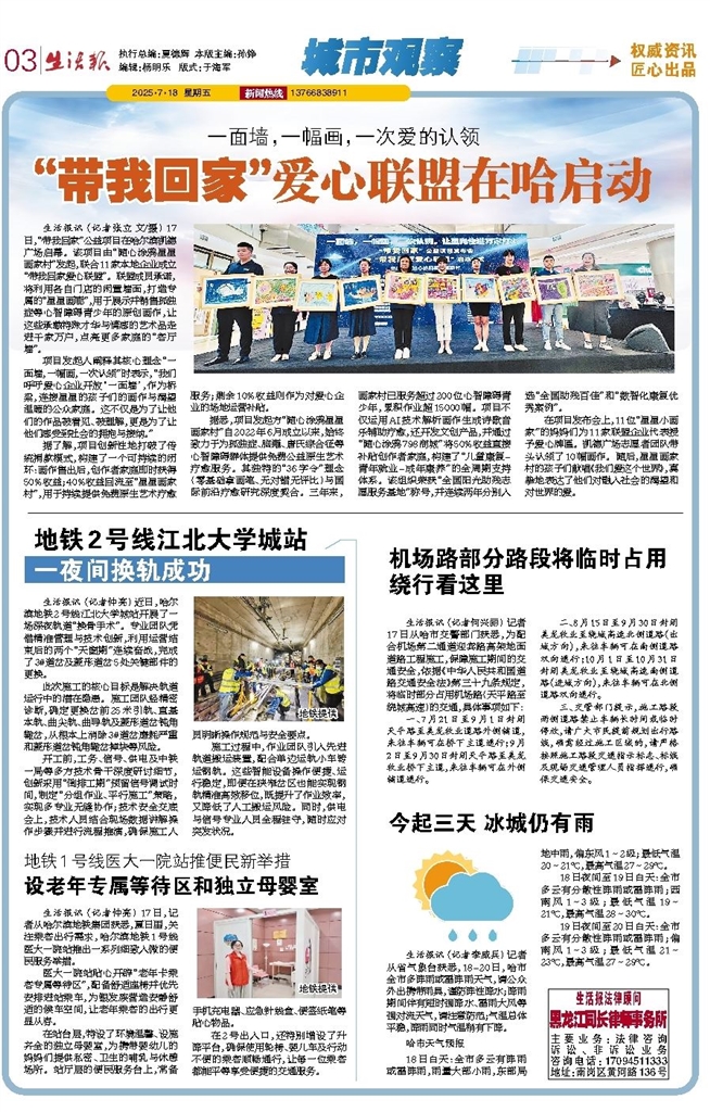 生活报讯 (记者张立 文/摄) 17日,“带我回家”公益项目在哈尔滨凯德广场启幕。该项目由“随心涂鸦星星画家村”发起,联合11家本地企业成立“带我回家爱心联盟”。联盟成员承诺,将利用各自门店的闲置墙面,打造专属的“星星画廊