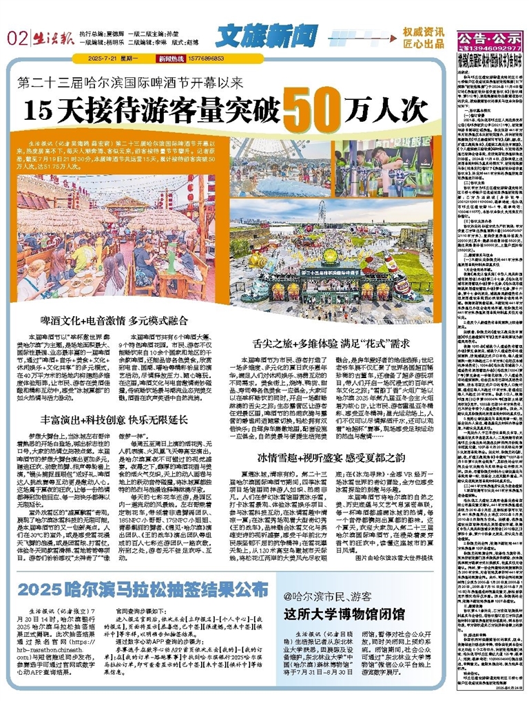 生活报讯 (记者吴海鸥 薛宏莉) 第二十三届哈尔滨国际啤酒节开幕以来,热度居高不下,每天人潮奔涌、客似云来,游客接待量节节攀升。记者获悉,截至7月19日21时30分,本届啤酒节共运营15天,累计接待游客突破50万人次,达5