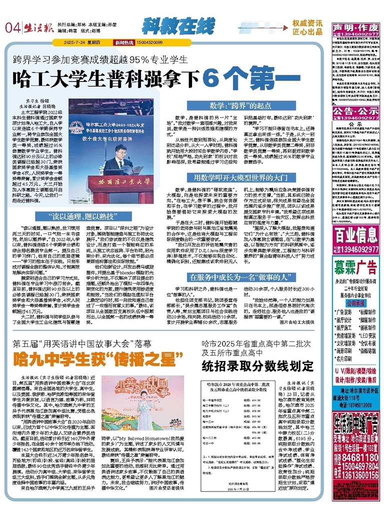 土木工程学院2022级本科生普科强通过国家专项计划考入哈工大,自入学以来连续6个学期保持专业第一,跨专业参加全国大学生数学竞赛,最终获数学类一等奖,成绩超过95%参赛数