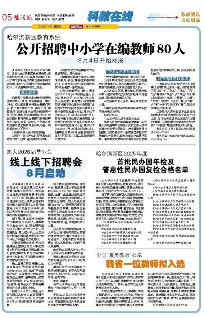 生活报讯 (实习生徐硕 记者吕晓艳) 记者从哈尔滨新区教育局获悉,该区现组织开展2025年度哈尔滨“丁香人才周”(春季)哈尔滨新区教育系统专项招聘,此次公开招聘中小学在编教师80人。本次招聘实行网上报名。