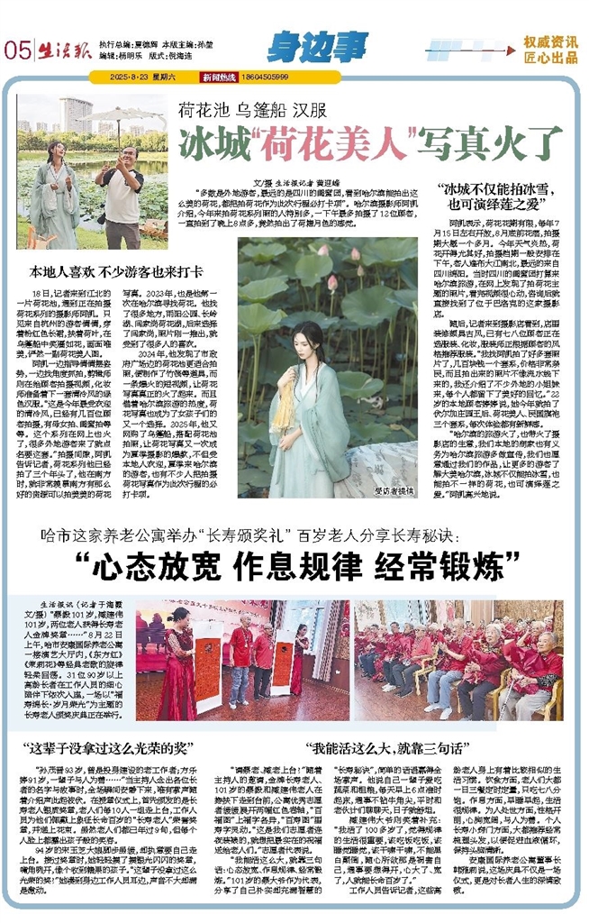 “多数是外地游客,最远的是四川的闺蜜团,看到哈尔滨能拍出这么美的荷花,都把拍荷花作为此次行程必打卡项”。哈尔滨摄影师阿凯介绍,今年来拍荷花系列照的人特别多,一下午最多拍摄了